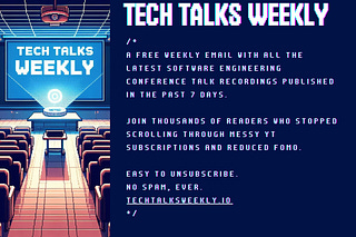 Join 7,900+ Software Engineers & Leads who receive a free weekly email with all the recently published podcasts and conference talks. Stop scrolling through messy YouTube subscriptions. Stop FOMO. No AI. Easy to unsubscribe. No spam, ever.
