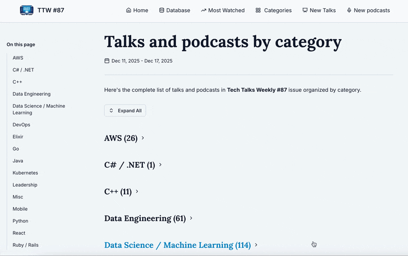 The complete Tech Talks Weekly database with +48,000 talks & podcasts, category-based view, most-watched talks.