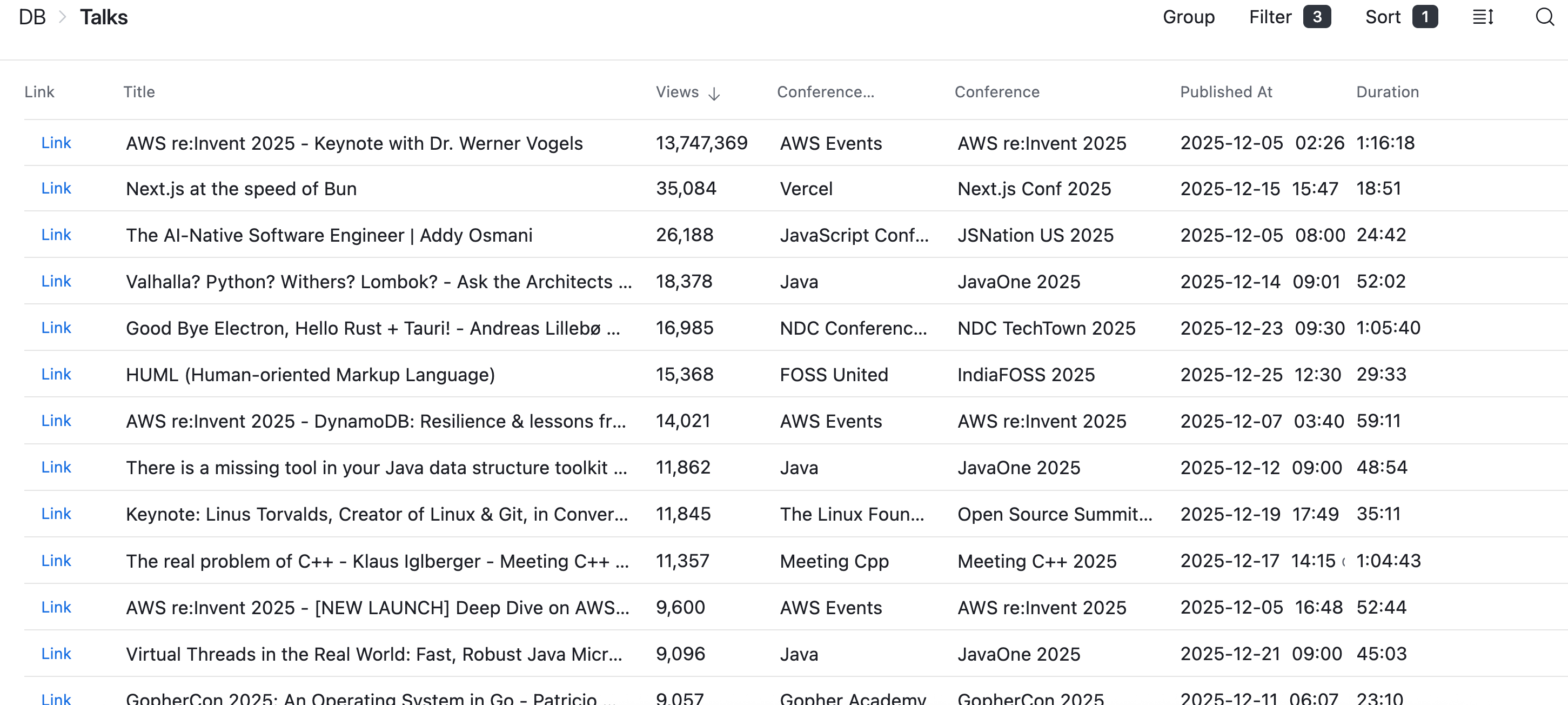 You get access to the entire Tech Talks Weekly database I use every week to build new issues. This includes talks from +100 major Software Engineering conferences and even more podcasts.Get the category-based view of new talks and podcasts.